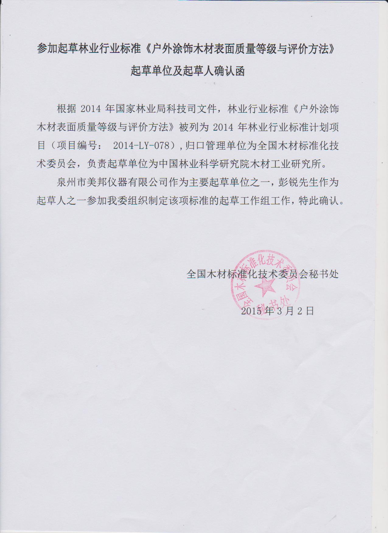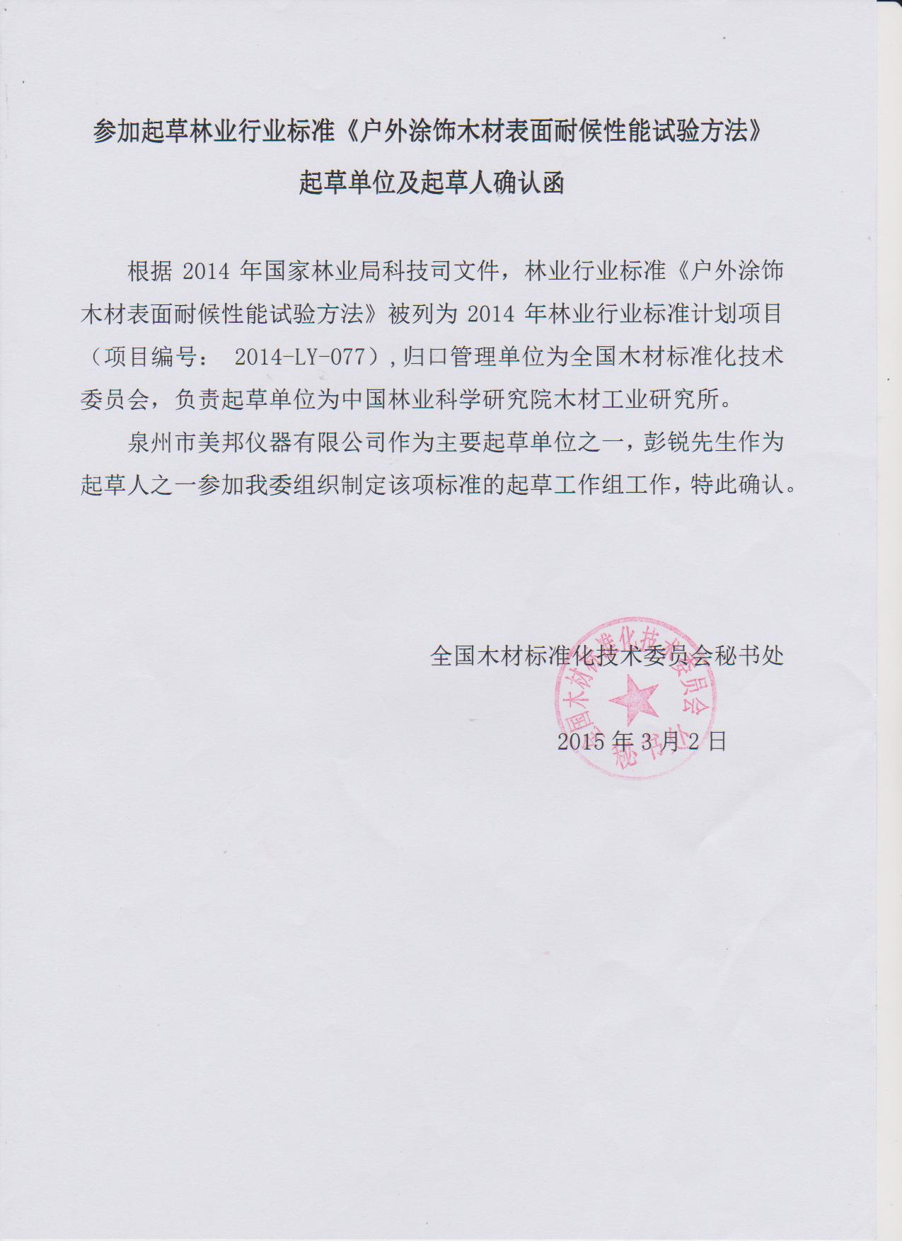 美邦儀器作為主要起草單位之一,公司總經理彭銳歷經千辛萬苦,經過多年的反復論證,通過不斷地修正,才得以定稿成型。所撰寫的《戶外涂飾木材表面耐候性能試驗方法》、《戶外涂飾木材表面質量等級與評價方法》兩標準,被列入2014全國林業(yè)行業(yè)標準計劃項目,編號分別為2014-LY-077、2014-LY-078。據(jù)了解,該標準主要負責單位為中國林業(yè)科學研究院木材工業(yè)研究所。